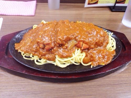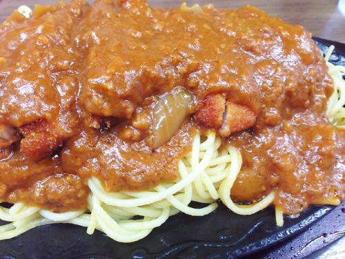 鉄板に乗ったミートソースに、とんかつがドーンと乗っている北海道釧路のご当地グルメです。